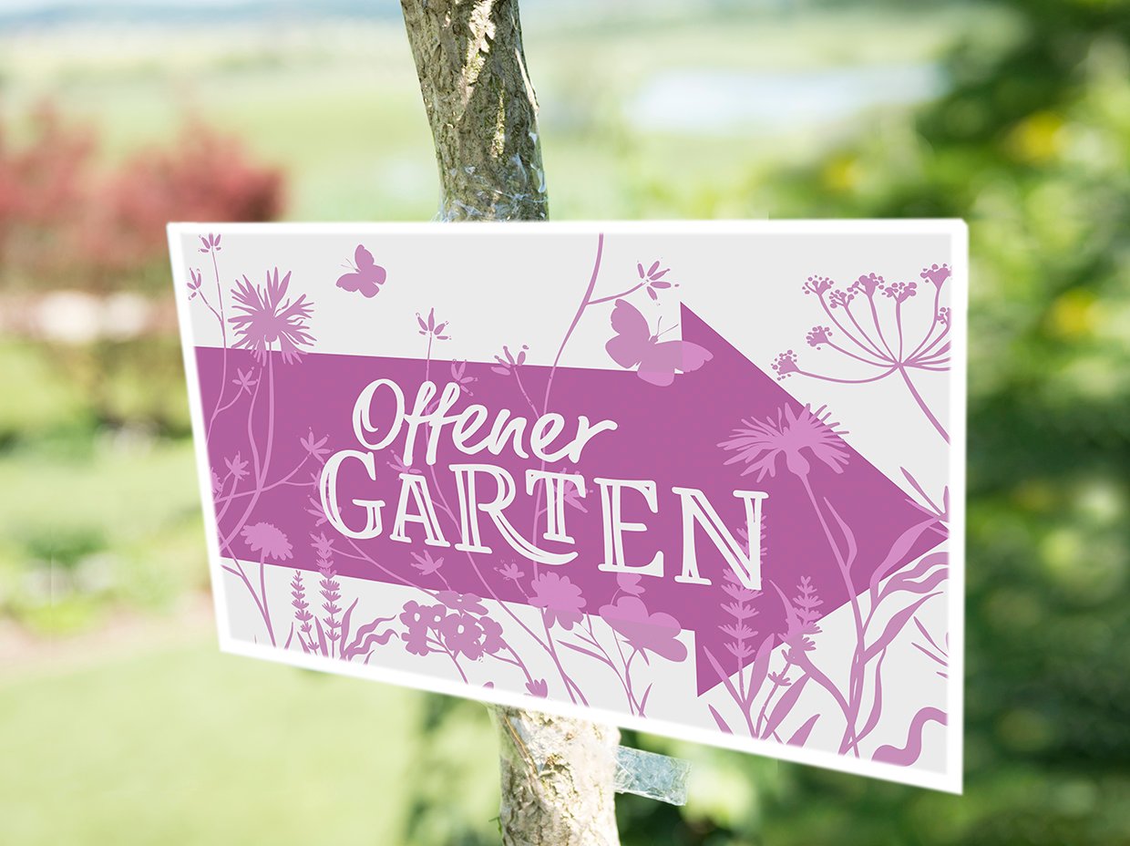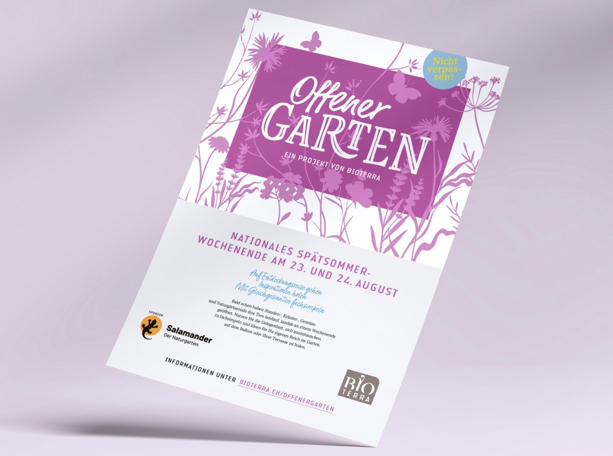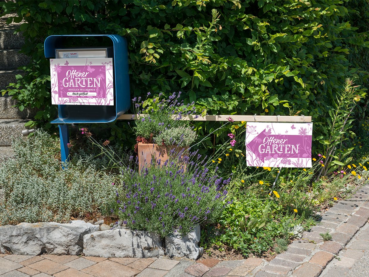 Entwicklung von Branding, darunter Logo, Inserate und Signaletik für die Aktion ‹Offener Garten›, die Besucherinnen und Besucher einlädt, private Gärten in der Schweiz zu entdecken.